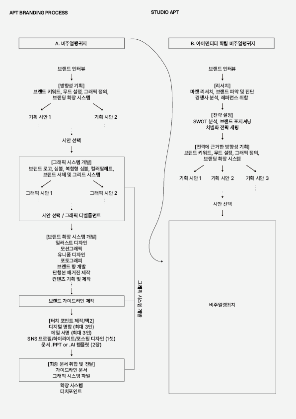 Apt는 다양한 비즈니스를 오랜시간 운영하며 쌓아온 경험과 디자인 전공 기반의 전문성으로 브랜드의 현실을 고려한 디자인을 제안합니다. 브랜드의 비즈니스 방향을 정확히 이해하고 그들의 가치와 메세지를 매력적으로 시각화하여, 브랜드의 한정된 에너지를 올바른곳에 사용하여 더 많은 비즈니스 기회를 얻을수 있도록 돕습니다.